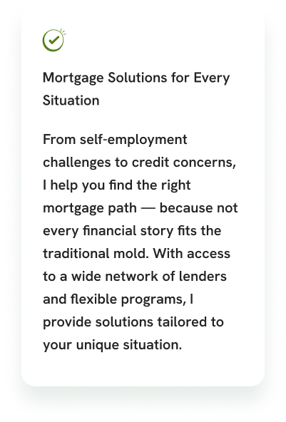 Personalized Mortgage Solutions for Every Goal whether you’re buying your first home, refinancing for better terms, or pursuing real estate investments, I provide mortgage solutions tailored to your unique objectives.