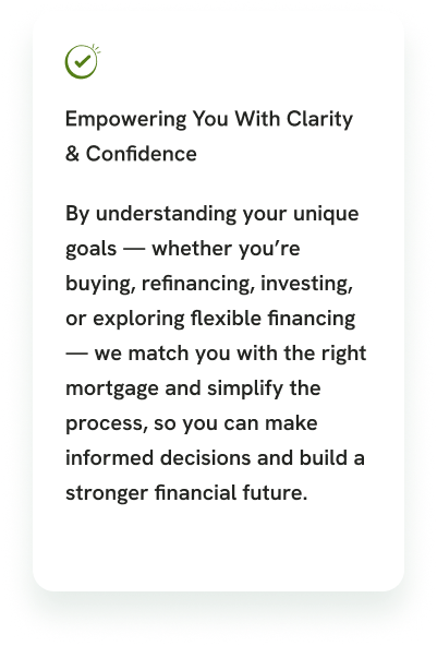 A mortgage is more than financing a home — it’s a foundation for your future. We believe your mortgage should serve your goals, not the banks’. Our mission is to provide smart, strategic solutions that help you build wealth, protect what matters most, and turn homeownership into a path toward financial freedom.